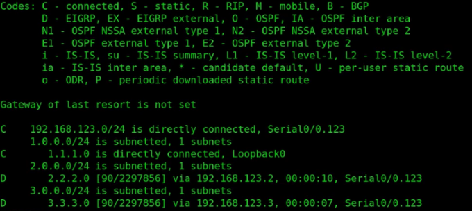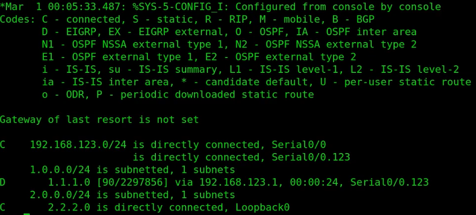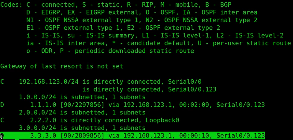 - 在R2的路由表中,有R1和R3的回环接口的条目,这些条目的前缀为“D”,这意味着这些条目属于EIGRP路由信息。
