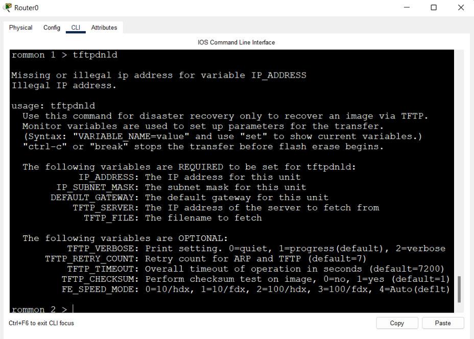Rommon 2 >IP_ADDRESS=10.0.0.1 Rommon 3 >IP_SUBNET_MASK=255.255.255.0 Rommon 4 >DEFAULT_GATEWAY=10.0.0.1 Rommon 5 >TFTP_SERVER=10.0.0.2 Rommon 6 >TFTP_FILE=Router-IOS.bin Rommon 7 >tftpdnld Rommon 8 >reset