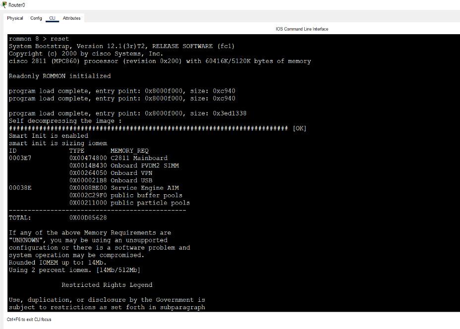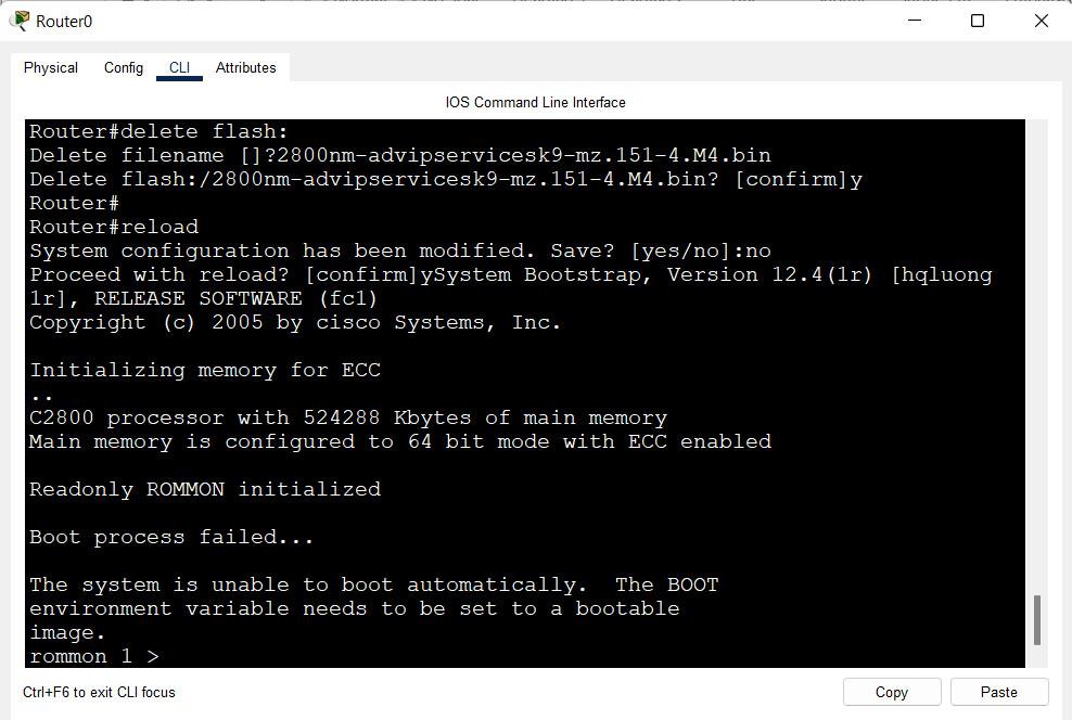 如您所见,存储在Flash存储器中的IOS文件已被删除,启动过程也失败了。当路由器无法从Flash中加载IOS时,启动过程就会失败,从而导致路由器无法正常运行。ROMMON模式.