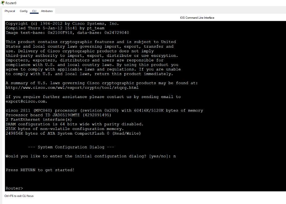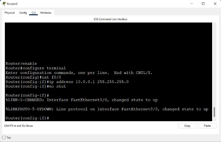 Router(config)#int f0/0 Router(config-if)#ip address 10.0.0.1 255.255.255.0 Router(config-if)#no shut