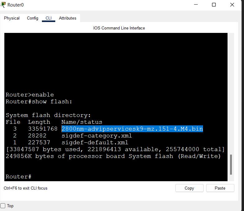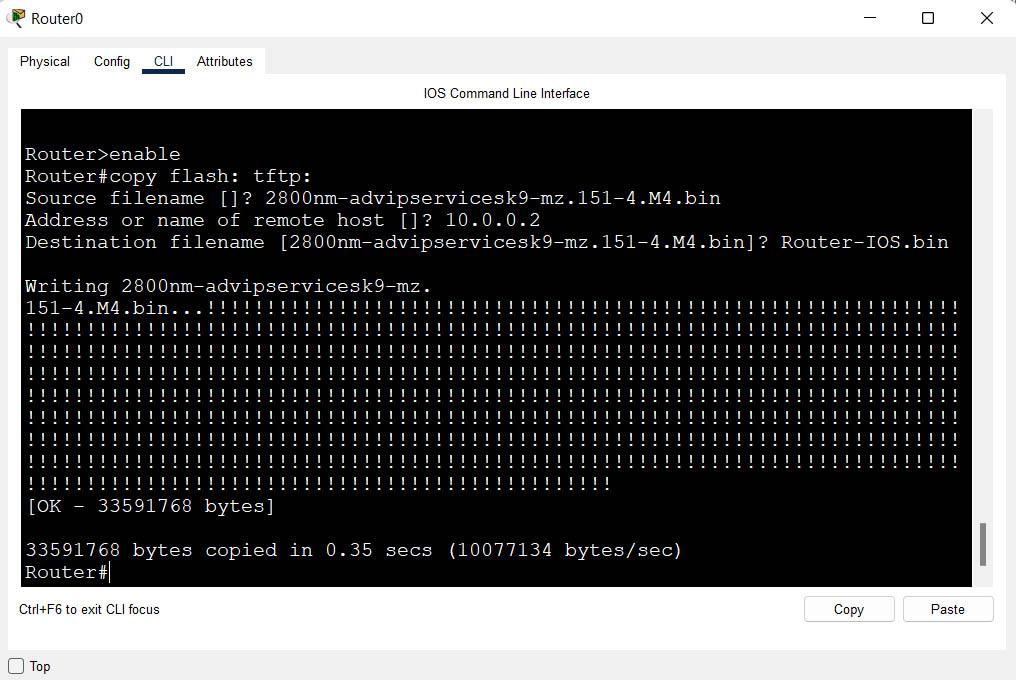Router#copy flash: tftp: Source filename []? 2800nm-advipservicesk9-mz.151-4.M4.bin Address or name of remote host []? 10.0.0.2 Destination filename [2800nm-advipservice sk9-mz.151-4.M4.bin]? Router-IOS.bin