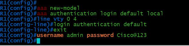 Router> enable Router# configure terminal Router(config)# aaa new-model Router(config)# aaa authentication login default local Router(config)# line vty 0 4 Router(config-line)# login authentication default Router(config-line)# exit Router(config)#username admin password Cisco@123