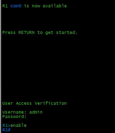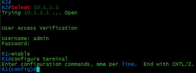 如您所见,当从R2访问R1上的telnet服务时,也启用了身份验证功能。要访问该服务,需要使用用户的凭据。
