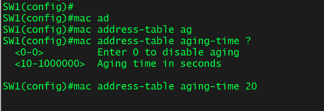 您还可以将MAC地址的刷新时间设置为10秒或1000000秒。如果您将老化计时器设置为0秒,那么老化计时器就会被禁用。