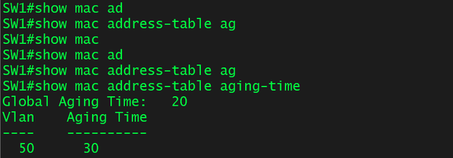 为了在两个节点之间切换数据包,交换机会保留MAC地址表一段时间,这个时间被称为“老化计时器”。这个老化计时器用于确定不通信设备的MAC地址应该被存储在CAM表中多长时间。所有VLAN的默认MAC地址刷新时间为300秒,即5分钟。