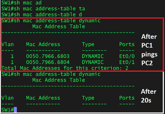 由于MAC地址的老化时间或刷新时间为20秒,而此时属于VLAN 1的情况,因此PC1和PC2之间无法进行通信。在这种情况下,两个设备的MAC地址都会被清除。