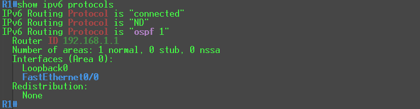 R1(config)#router ospfv3 1 R1(config-router)#router-id 192.168.1.1 R1(config-router)#exit R1(config)#interface FastEthernet0/0 R1(config-if)#ospfv3 1 ipv6 area 0 R1(config-if)#interface loopback0 R1(config-if)#ospfv3 1 ipv6 area 0