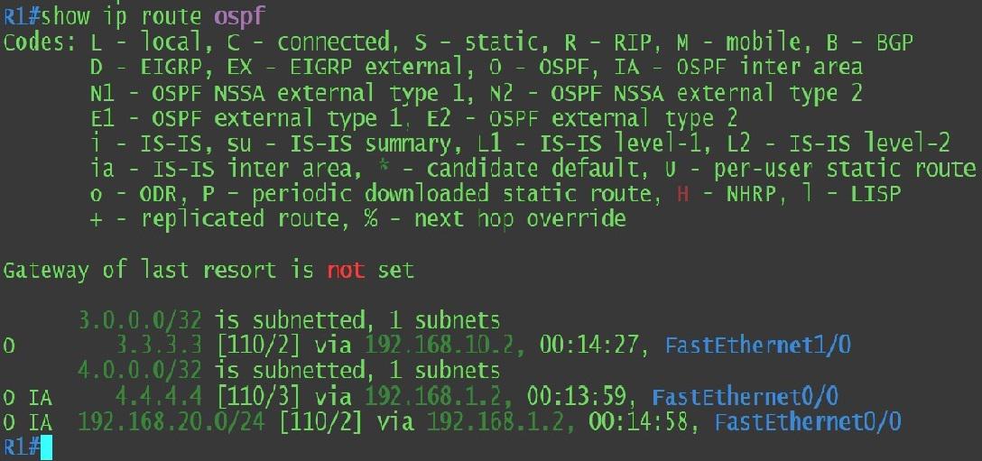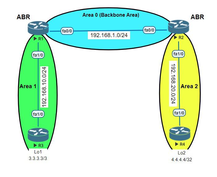R4 configuration: R4(config)#router ospf 1 R4(config-router)#network 192.168.20.0 0.0.0.255 area 2 R4(config-router)#network 4.4.4.4 0.0.0.0 area 2