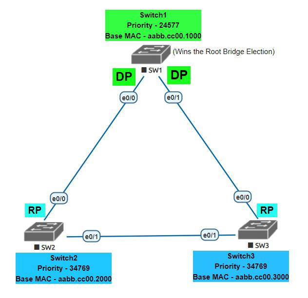 - Switch2的基MAC地址比Switch3的基MAC地址低,因此Switch2在担任DP角色时具有优势。于是,其e0/1端口就被选为DP端口。