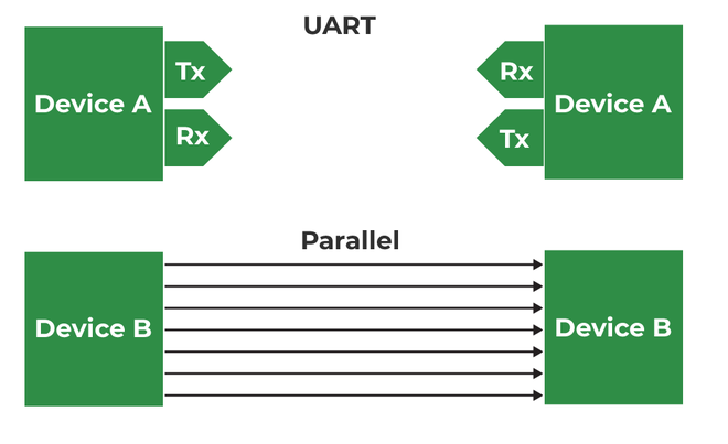 如果设备A想要发送数据,那么它就会通过发射器的引脚来发送数据。此时,设备B作为接收器,可以接收到这些数据。而如果设备A希望接收数据的话,那么就可以通过设备B的TX端口来接收这些数据了。 如果将这种UART的串行通信方式与并行通信方式进行比较的话,可以发现,在并行通信中需要多个总线来传输数据。 从线路数量来看,UART的复杂性较高,不过在速度方面,并行通信则更为优越。