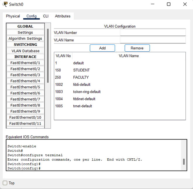 步骤2:让我们创建两个VLAN。第一个VLAN的名称设为VLAN-STUDENT,第二个VLAN的名称则设为VLAN-FACULTY。要配置这些VLAN,我们需要进入交换机Switch0,然后选择“Config”→“SWITCHING”→“VLAN Database”。现在,我们将VLAN-STUDENT的编号设定为150,而VLAN-FACULTY的编号则设定为250。接着,将这些编号添加到VLAN数据库中。