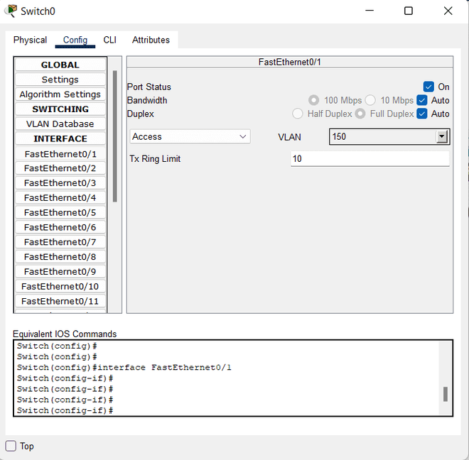 步骤3:接下来,我们需要选择属于VLAN-STUDENT的宿主设备。在这里,我选择了IP地址为192.168.10.1到192.168.10.3的设备,将它们归入VLAN-STUDENT。为此,我们需要选择交换机Switch0→Config→INTERFACE。在这里,我们选择FastEthernet0/1接口,该接口对应的宿主设备的IP地址为192.168.10.1,该设备显然属于VLAN-STUDENT。现在,我们点击“VLAN”旁边的向下箭头,然后选择“150:STUDENT”,这个选项就是用于学生VLAN的。