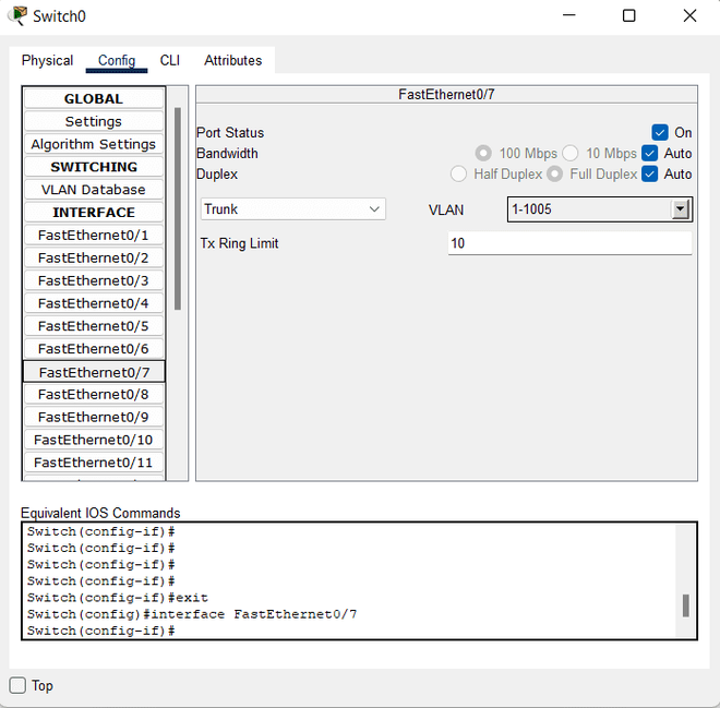 步骤5:最后,只需将FastEthernet0/7的交换机端口模式从“Access”切换到“Trunk”即可。