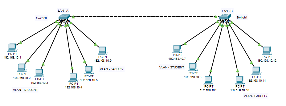 让我们在Cisco Packet Tracer中创建一个网络,并为其配置VLAN。这里,我们创建了两个局域网,每个局域网都有6台主机。在每个局域网上,我们再分别创建两个VLAN,然后尝试让这两个VLAN之间进行通信。