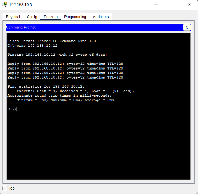 让我们向LAN-A VLAN-FACULTY中的192.168.10.5发送ping请求,目标地址为LAN-B VLAN-FACULTY中的192.168.10.12。要再次发送ping请求,请在具有IP地址为192.168.10.5的主机的命令提示符下运行该命令。