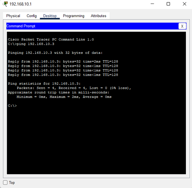 现在,我们的VLAN配置已经完成了。我们可以通过在LAN-A下从一个主机向另一个主机发送数据包来验证这一设置是否正确。让我们从192.168.10.1向192.168.10.3发送一个ping请求吧。为此,首先需要选择IP地址为192.168.10.1的主机,然后点击“桌面”→“命令提示符”。接下来,运行以下命令来发送ping请求到192.168.10.3。