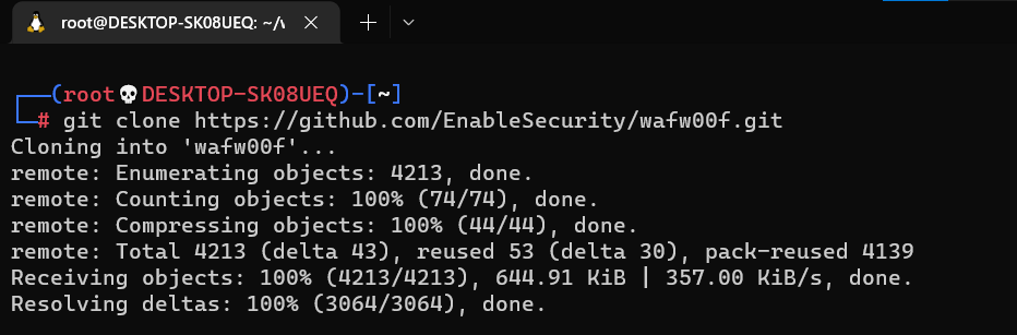 步骤2:使用以下命令进行克隆操作: `git clone https://github.com/EnableSecurity/wafw00f` 输入该命令后,请在其末尾按回车键完成操作。