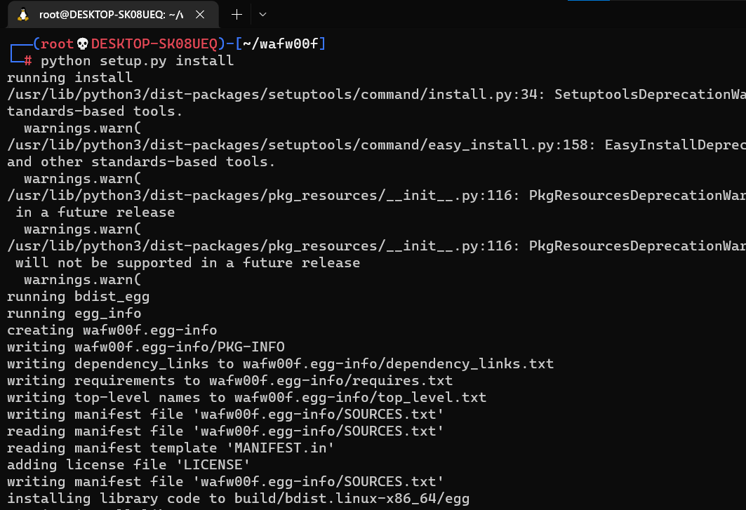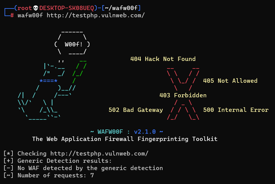 步骤4:wafw00f <url>(例如:wafw00f http://testphp.vulnweb.com/)。