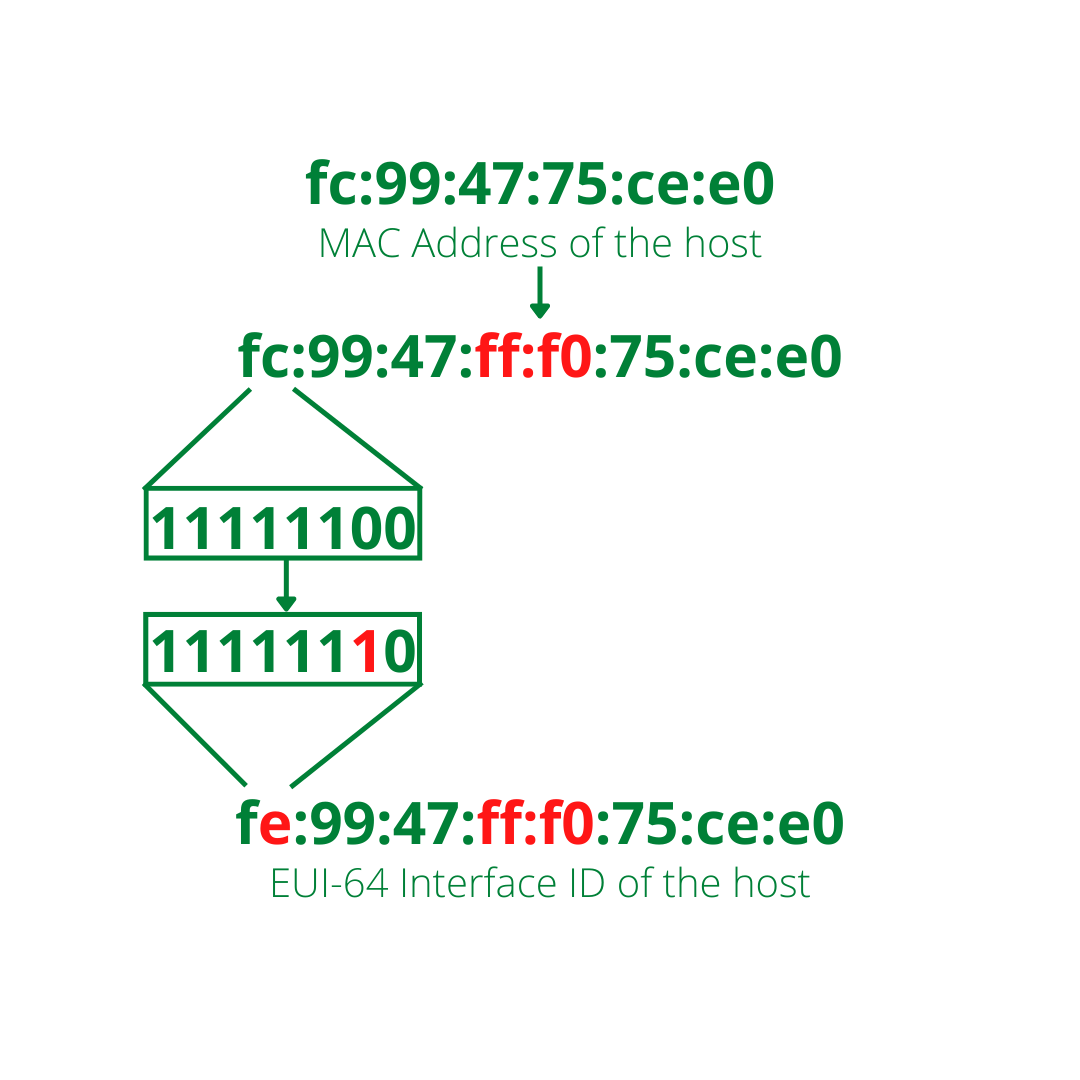 - 在48位的MAC地址中间,加上十六进制数值FFFE。