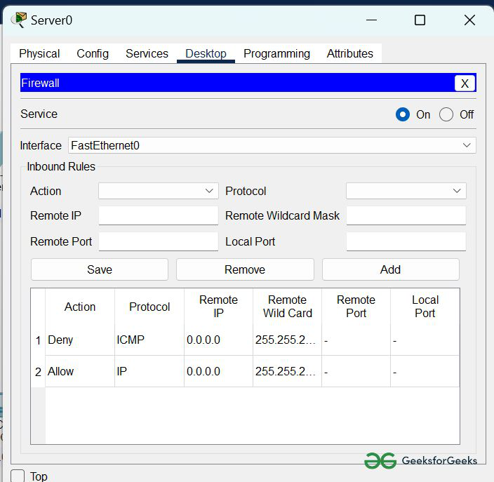 - 首先,拒绝ICMP协议,并将远程IP地址设置为0.0.0.0,同时将远程通配符掩码设置为255.255.255.255。