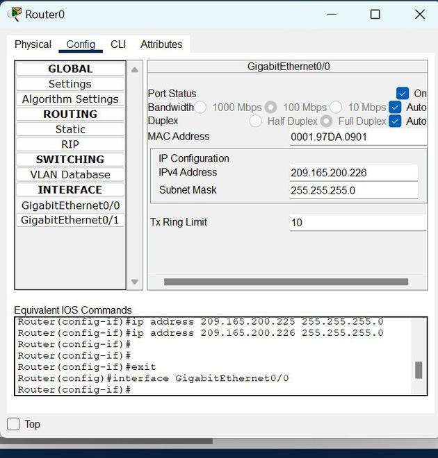 | router0 | 千兆以太网0/0 | 209.165.200.226 | 255.255.255.0 |
