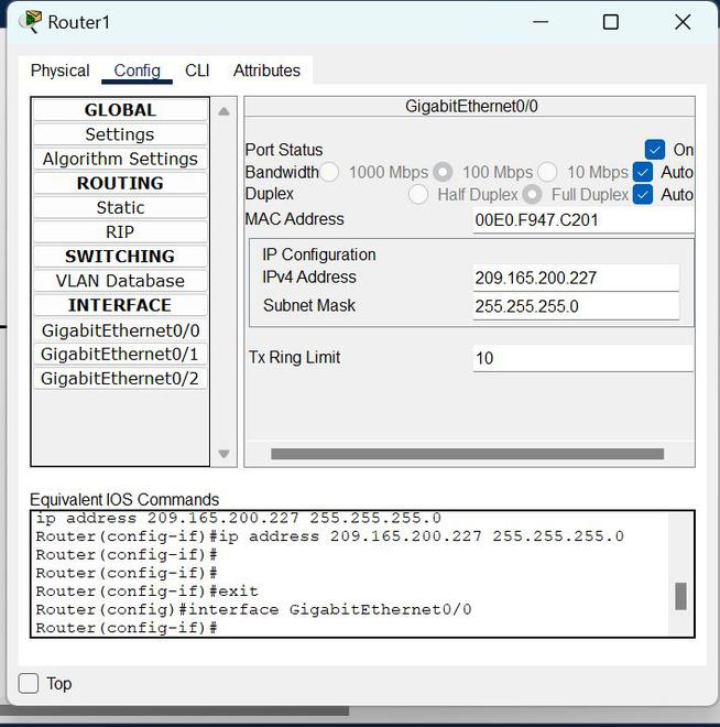 | 路由器1 | 千兆以太网0/0 | 209.165.200.227 | 255.255.255.0 |