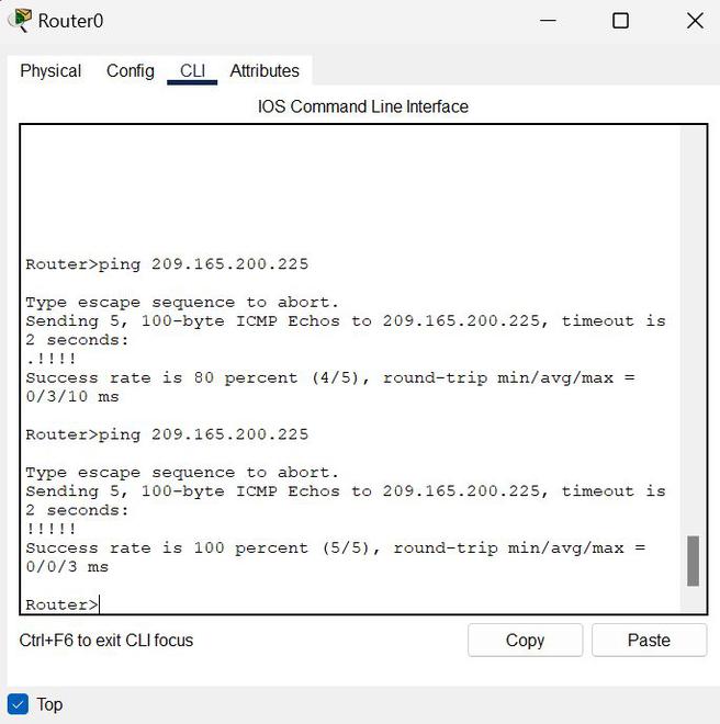 步骤3:请通过向Router0和Router1中的服务器的IP地址发送ping命令,来验证NTP服务器的配置是否正确。