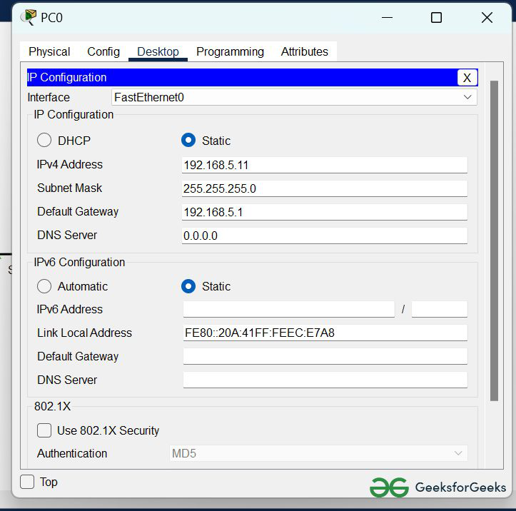 | PC0 | 192.168.5.11 | 255.255.255.0 | 192.168.5.1 | 无 |