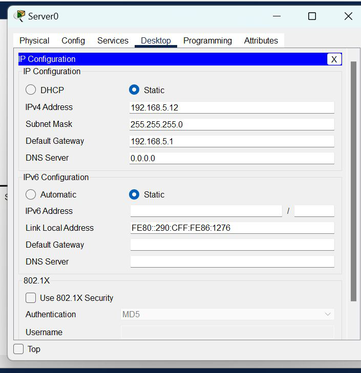 - 将服务器的名称设置为 cisco.com,然后输入地址 192.168.5.12。