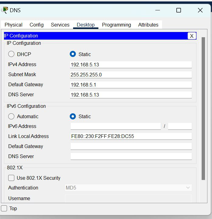 | DNS | 192.168.5.13 | 255.255.255.0 | 192.168.5.1 | 192.168.5.13 |