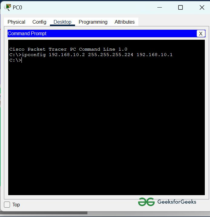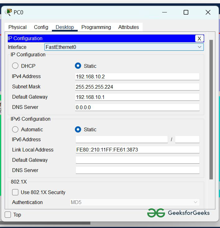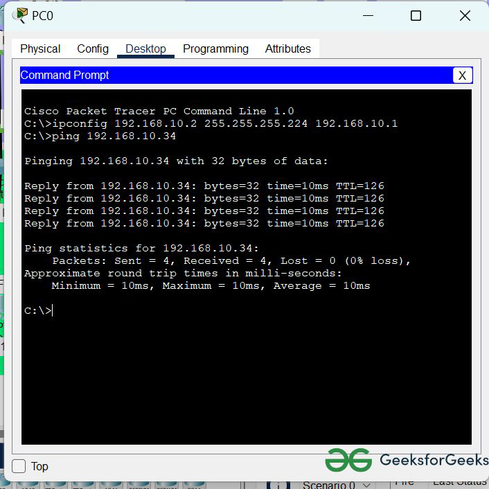 | PC0 | 192.168.10.2 | 255.255.255.242 | 192.168.10.1 |