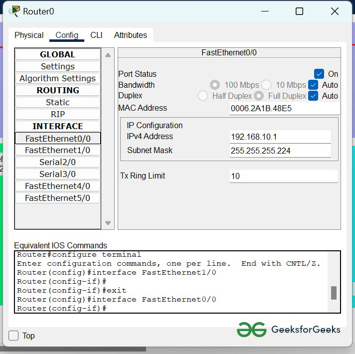 | router0 | FastEthernet0/0 | 192.168.10.1 | 255.255.255.224 |