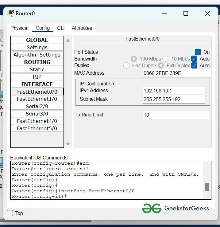 | router0 | FastEthernet0/0 | 192.168.10.1 | 255.255.255.192 |