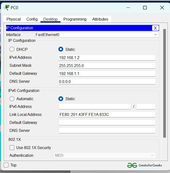 | pc0 | 192.168.1.2 | 255.255.255.0 | 192.168.1.1 |