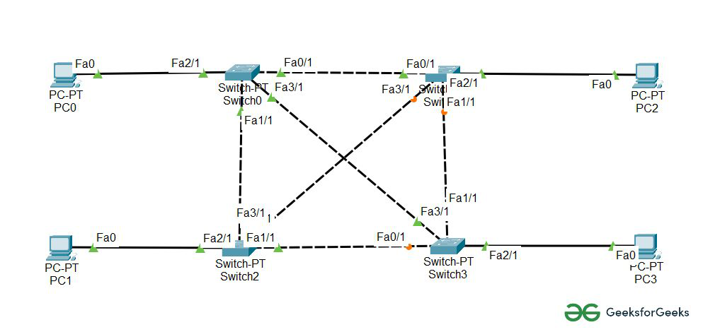 - 下面是对该实验的模拟过程。我们发送了两个PDU数据包:一个从PC0发送到PC3,另一个则从PC1发送到PC2。