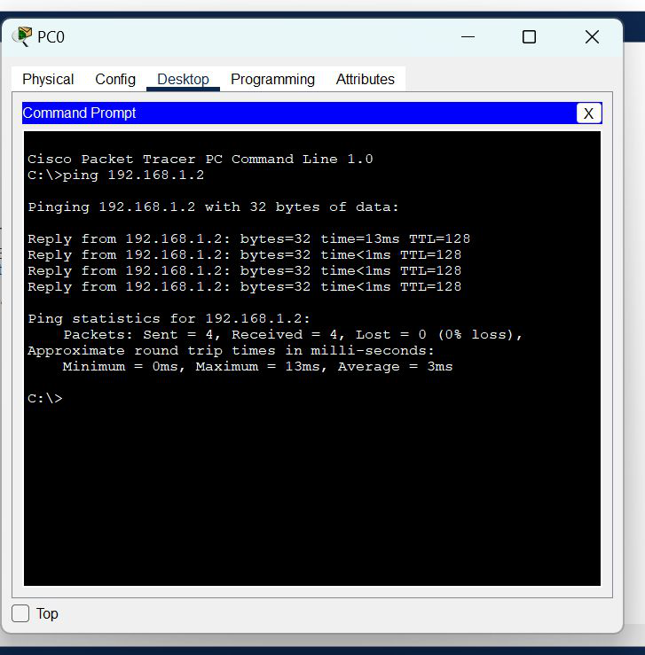 - 为了验证连接是否正常,我们将尝试向 PC0 中的 PC1 的 IP 地址发送ping请求。