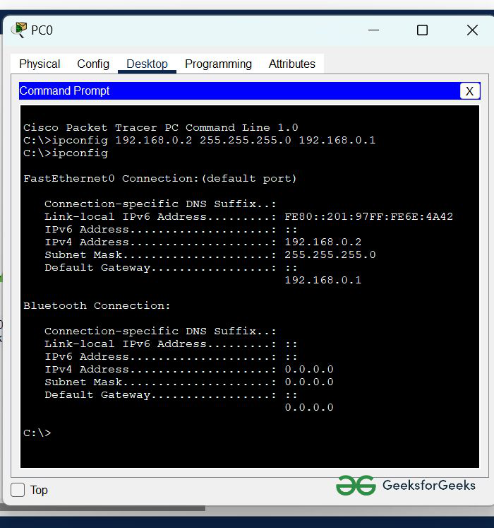 - 然后,输入“ipconfig”命令,并按照下图所示的方式配置PC0。