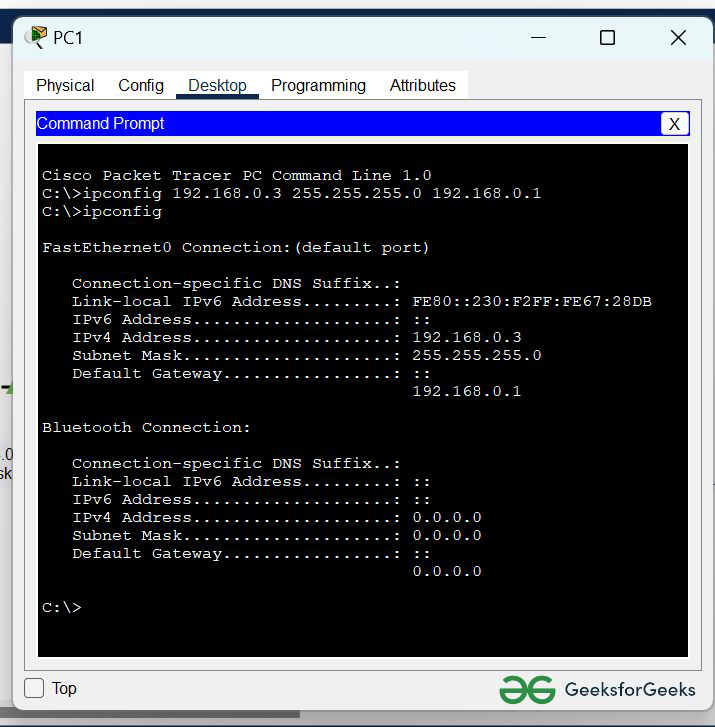 Command: ipconfig 192.168.0.3 255.255.255.0 192.168.0.1