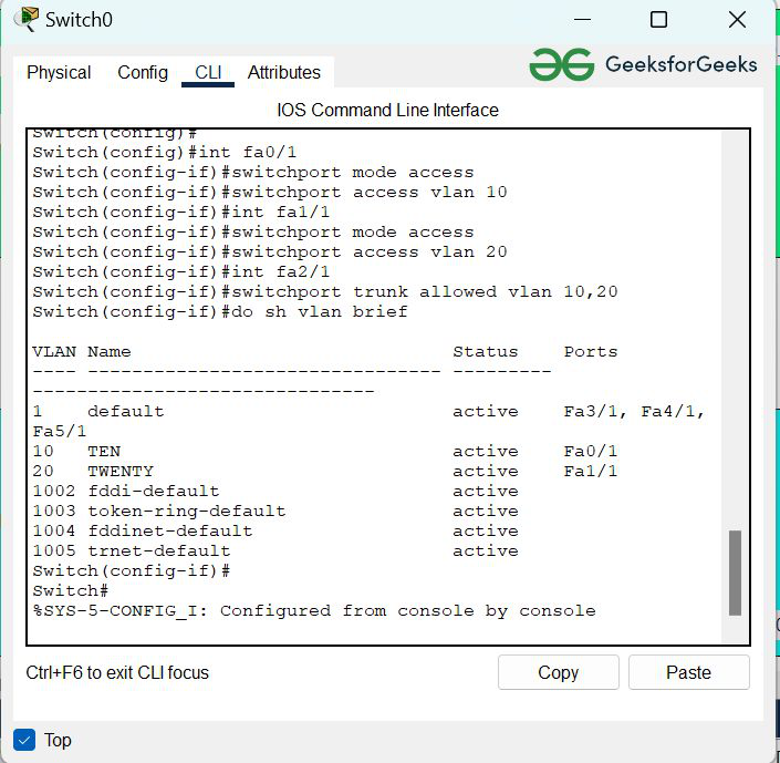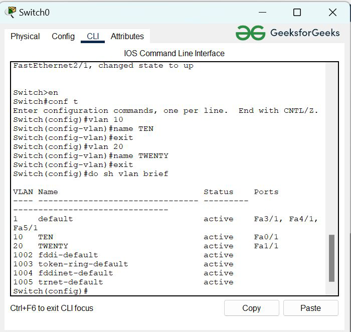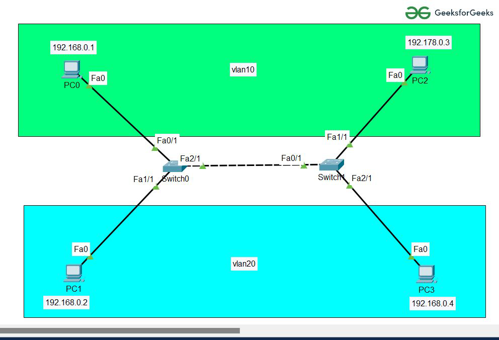 例如我们已经创建了两个虚拟局域网组,分别是 vlan10 和 vlan20。因此,我们需要配置交换机,以便能够与属于这些虚拟局域网组的设备进行通信。如果在 vlan20 中,我们尝试ping PC0的IP地址,那么肯定能收到回复。但是,如果我们尝试ping属于其他虚拟局域网组的设备的IP地址,则会遇到错误,因为这些设备的IP地址属于不同的虚拟局域网组。