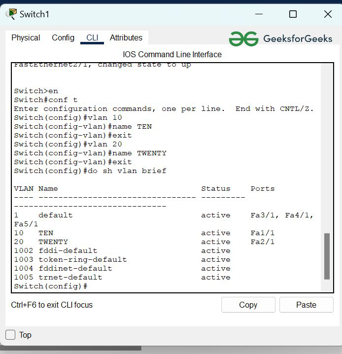 步骤1:利用两个局域网网络,即VLAN10和VLAN20,来创建一个网络拓扑结构。接下来,需要配置并验证能够跨越多个交换机的正常VLAN范围。