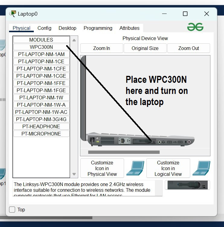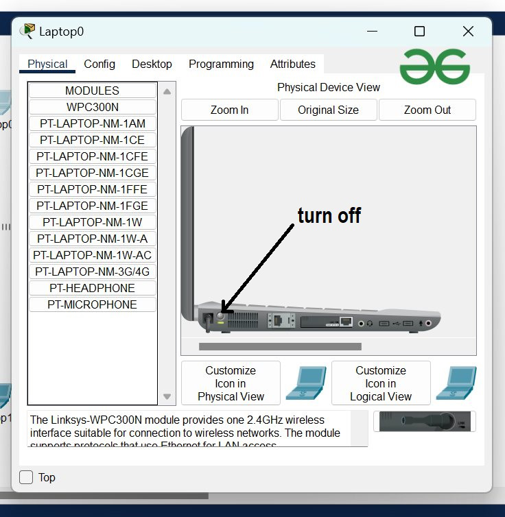 步骤2:将笔记本电脑配置为无线模式。首先,点击“laptop0”,然后关闭其电源。这样,我们就可以用无线端口来替代原来的有线端口了。WPC300N.