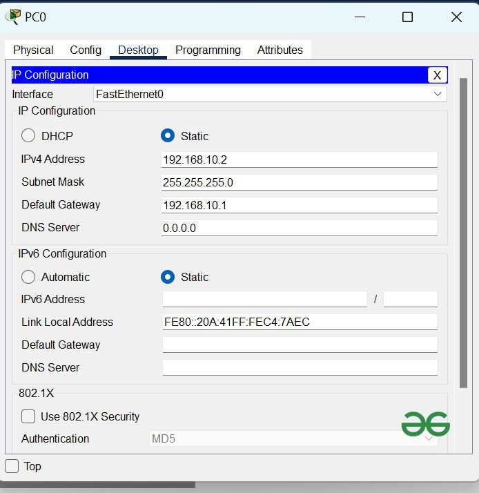 | PC0 | 192.168.10.2 | 255.255.255.0 | 192.168.10.1 |