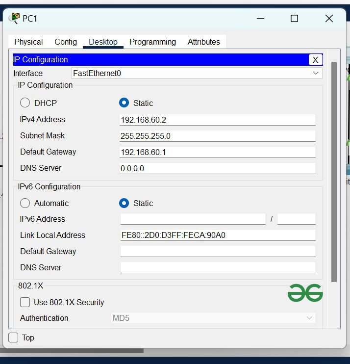 | PC1 | 192.168.60.2 | 255.255.255.0 | 192.168.60.1 |