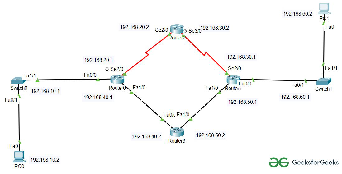 从下面的图片可以看出,从路由器1到路由器3的路径被阻塞了。因此,数据包会选择另一条路径来到达目的地,也就是PC0。