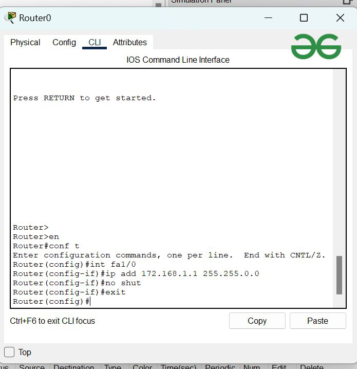 Router#Router#enRouter#conf tRouter(config)#int fa1/0Router(config-if)#ip add 172.168.1.1 255.255.0.0Router(config-if)#no shutRouter(config-if)#exitRouter(config)#exitRouter#
