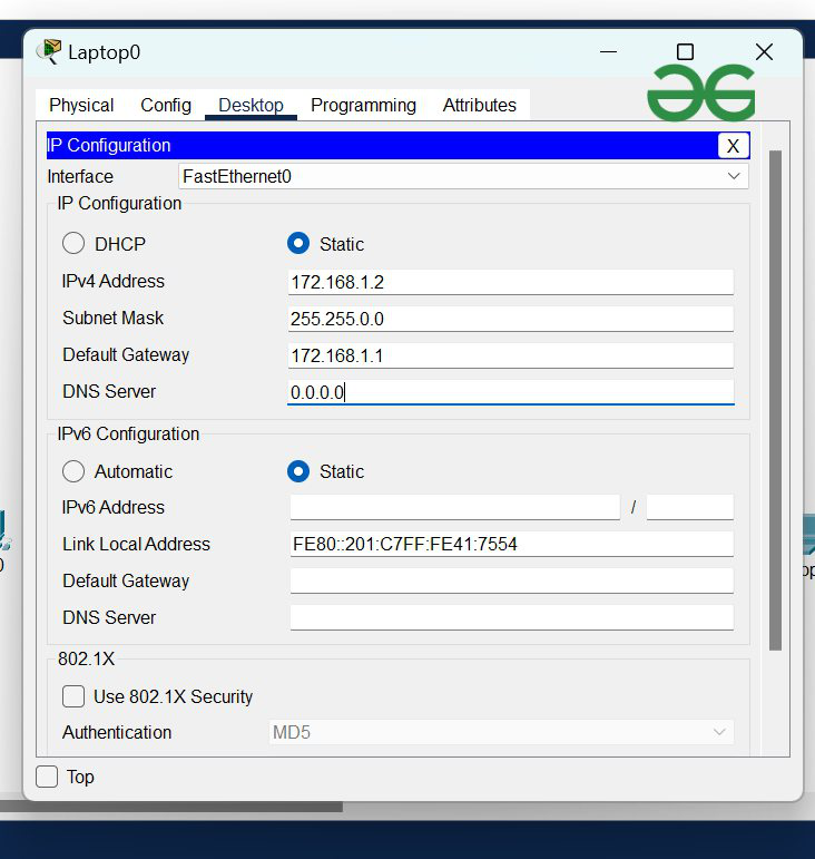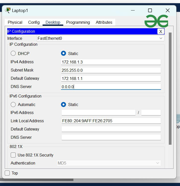 - 根据IP地址表,为Laptop1配置一个IPv4地址以及默认网关。