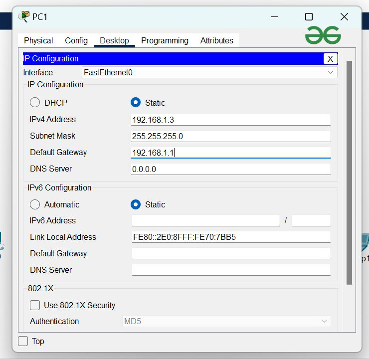 | 192.168.1.3 | 192.168.1.1 | 255.255.255.0 |