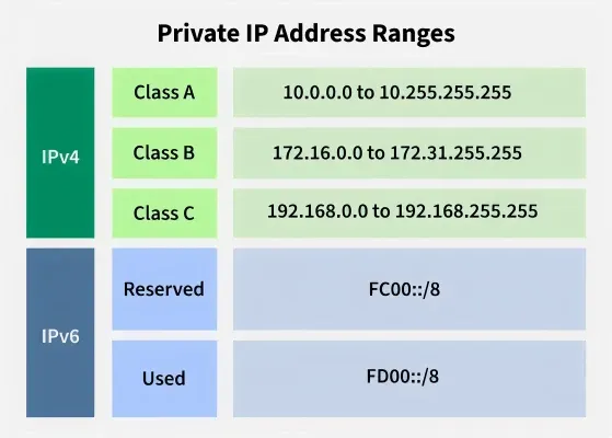 私有IP地址存在于由互联网号码分配机构(IANA)所指定的特定范围内。这些私有IP地址范围通常被预留用于私有网络。这些网络包括家庭网络、办公网络等。局域网这些地址在公共互联网上无法被路由,因此它们的主要用途是用于识别本地网络中的机器。这两种地址都有各自的私有IP地址范围。IPv4以及IPv6.