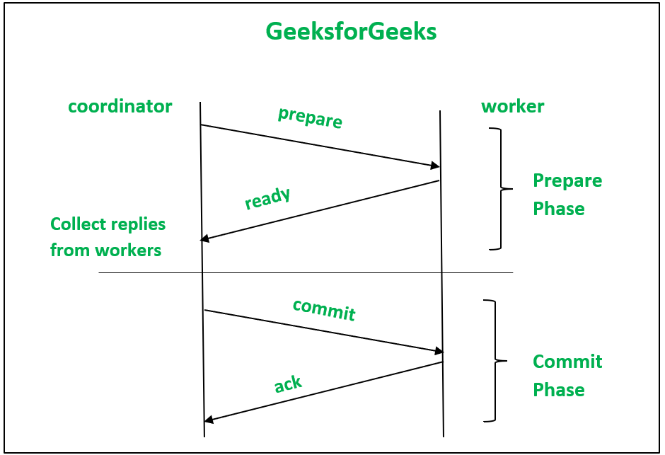 - 在这个阶段,协调员会检查各个工作节点是否发送了“已准备就绪”的消息。如果所有工作节点都发送了此类消息,那么才会向每个工作节点发送“已提交”的消息;否则,就会向每个工作节点发送“中止”的消息。