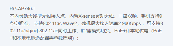 总速率2.966G是三个射频卡速率之和,那三张射频卡速率分别是多少呢?每个射频卡有几条空间流呢?AP-740-I,产品命名中的4代表该产品是4条空间流,这是锐捷的命名规则。那么就可以判断出,2.4G和5G射频卡都是4条空间流,2.4G/5G可选的射频卡只有一条空间流。速率为: